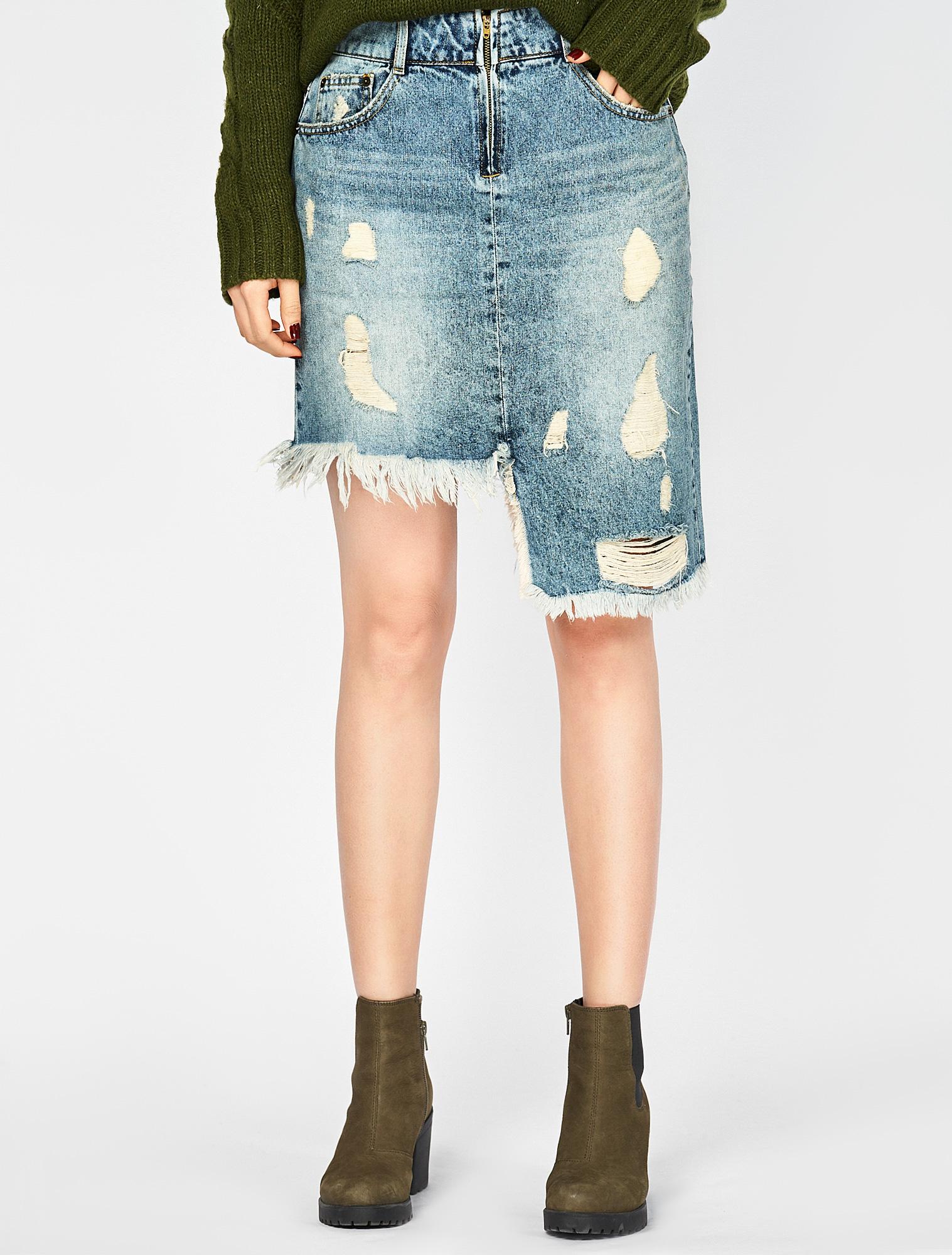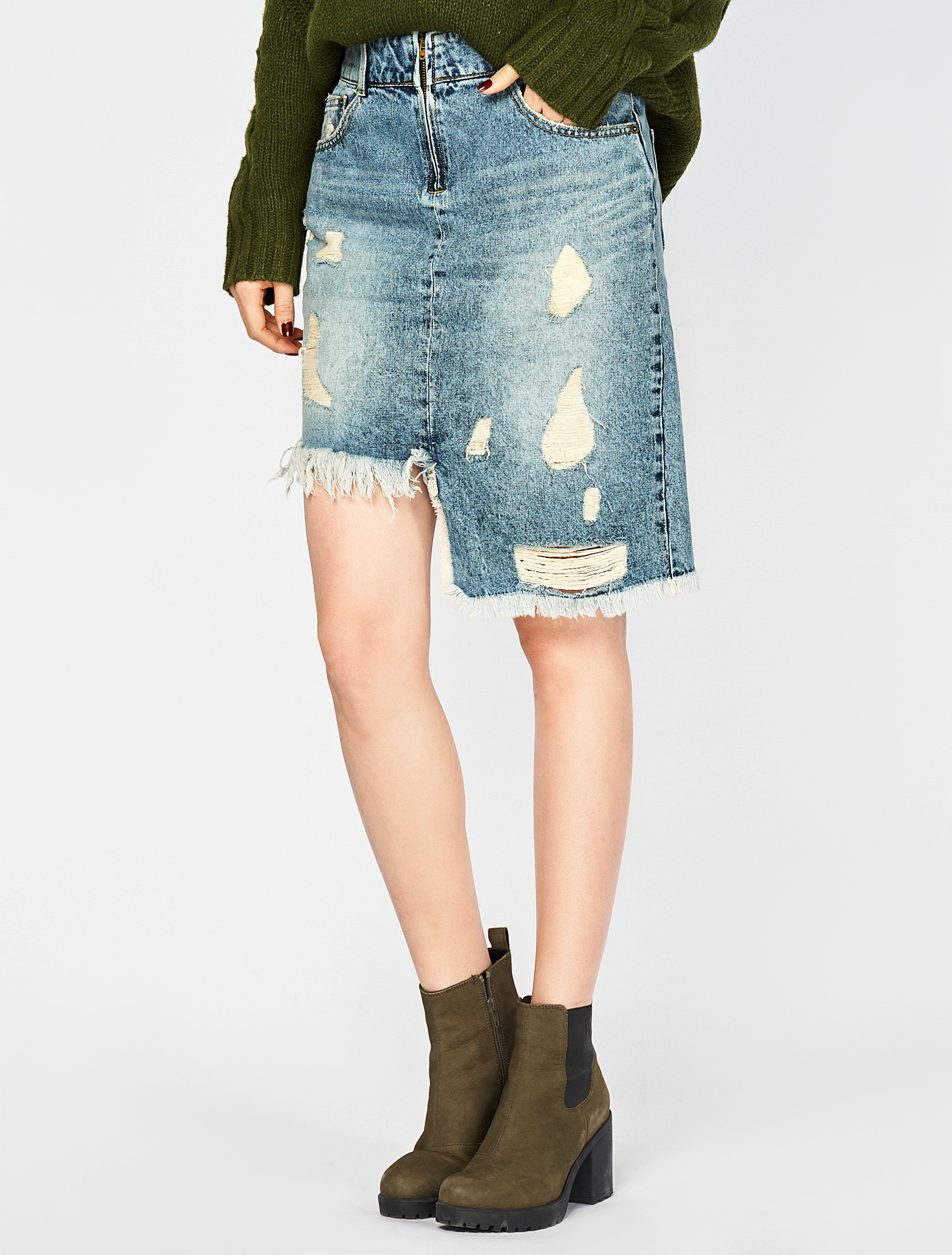 - Chân váy denim lệch gấu, xé rách, mài bạc mặt trước